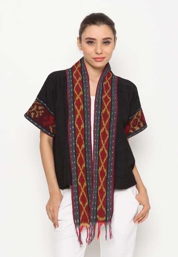 Model baju tenun perempuan terbaru yang pertama ini berbentuk outer yang memadukan antara kain tenun berwarna merah dan kuning dengan kain polos yang lebih gelap. Baju tersebut tidak membutuhkan kain tenun yang banyak. Kamu hanya perlu memakai kain tenun untuk ujung lengan dan bagian tengah baju saja. Nah, bagian tengah baju tersebut dibuat menyerupai scarf yang diarahkan ke belakang kepala dengan panjang melebihi ujung baju. -
