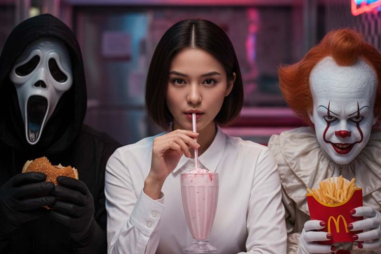 Dalam prompt ini, Anda akan duduk di sebuah diner retro Amerika bersama dua karakter ikonik Halloween, Ghostface dan Pennywise. Gunakan pencahayaan neon merah muda dan biru untuk menciptakan atmosfer yang lucu namun sedikit menyeramkan. Pakaian Anda bisa berupa kaos Halloween dengan gambar labu dan hantu, sementara riasan harus tampak glam editorial.