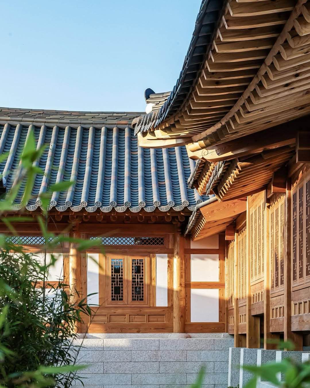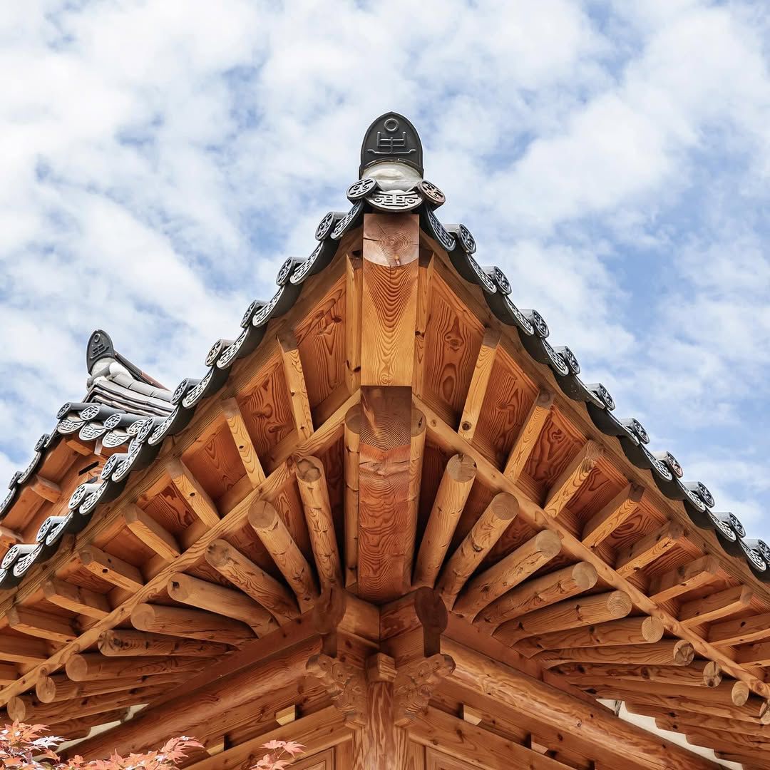 Atap giwa yang melengkung bukan hanya elemen estetika, tetapi berfungsi mengalirkan air hujan dan menahan salju di musim dingin. Sementara bagian tepi atap, cheoma, dibuat dengan lengkung khas yang menentukan intensitas cahaya matahari yang masuk ke interior. Di balik kesederhanaannya, setiap detail adalah hasil dari logika arsitektur yang matang, bentuk yang lahir dari fungsi, bukan sekadar gaya.