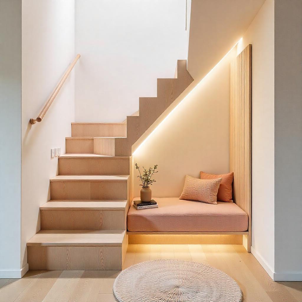 Pencahayaan di area tangga tidak boleh diabaikan. Pencahayaan berfungsi untuk menerangi tangga, sehingga tidak terjadi kecelakaan. Hal ini juga dapat memperkuat nuansa area tangga dan ruangan sekitar. Anda bisa menempatkan tangga di dekat jendela atau atap skylight untuk pencahayaan alami.