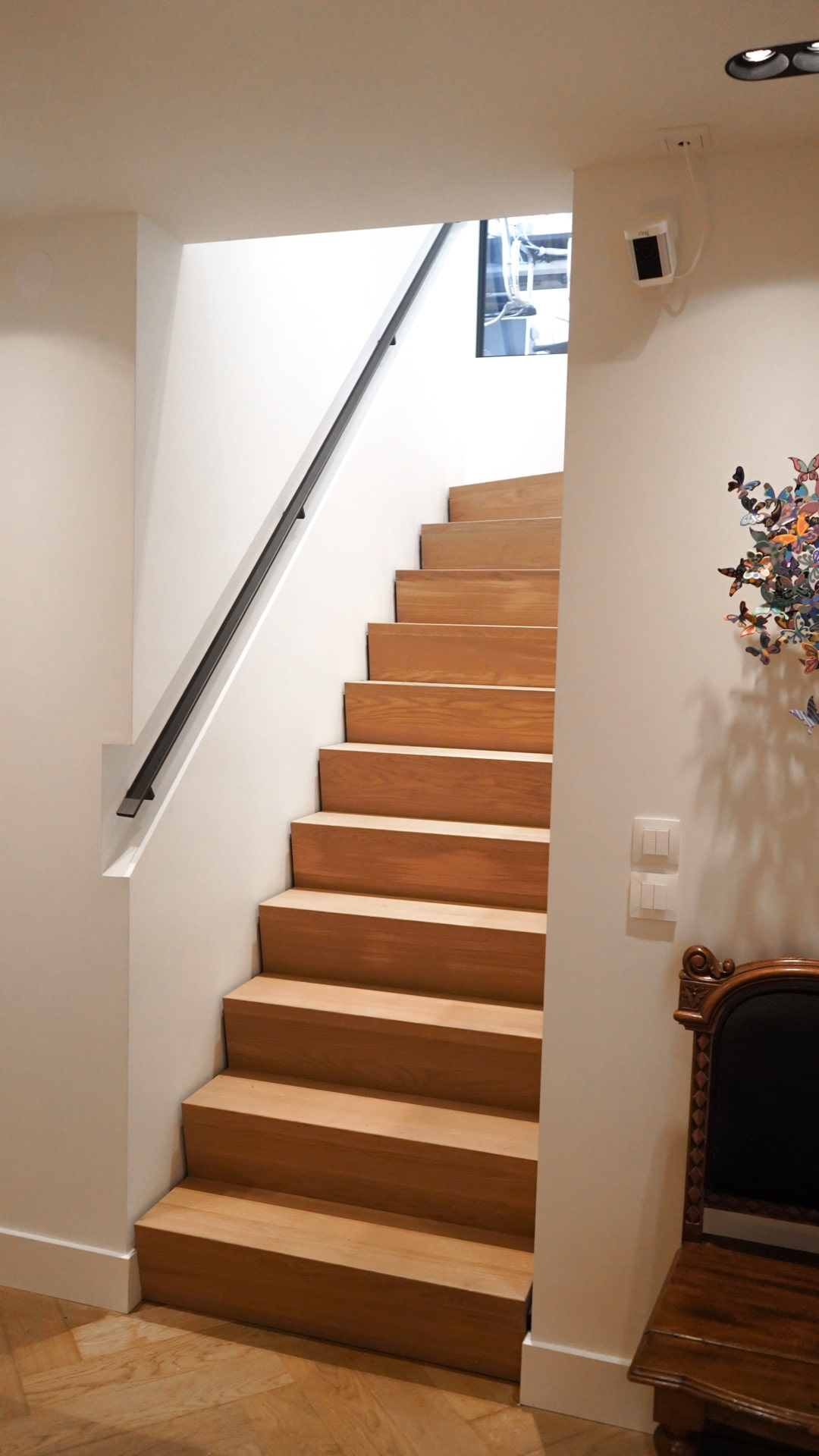 Posisi tangga yang pertama terletak di antara tembok. Posisi ini memaksimalkan ruang yang tersedia, khususnya pada area sempit. Tembok juga memberikan pegangan tambahan di kedua sisi. Posisi ini memungkinkan pemasangan handrail yang sederhana, sehingga menonjolkan kesan minimalis pada ruangan.