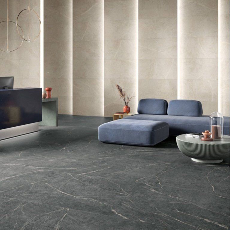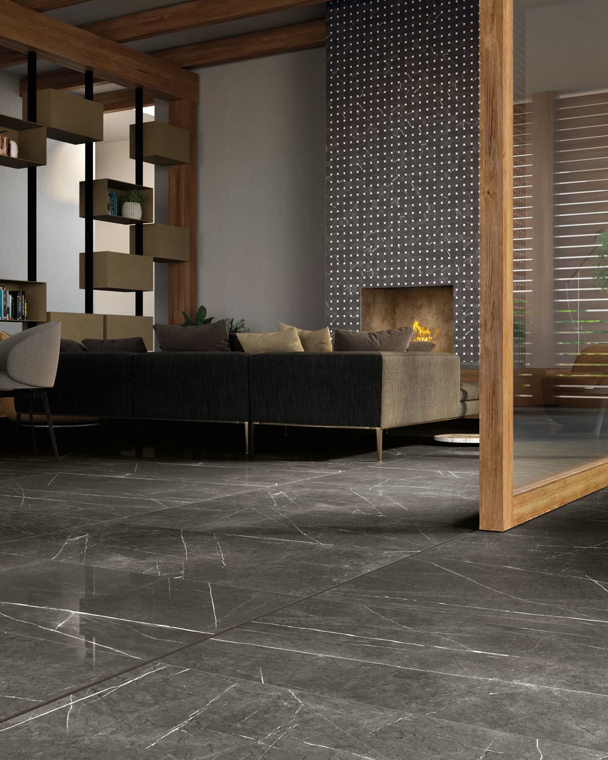 Berwarna hitam pekat dengan guratan putih kontras, menciptakan kesan dramatis dan elegan. - Marmer Crema Marfil